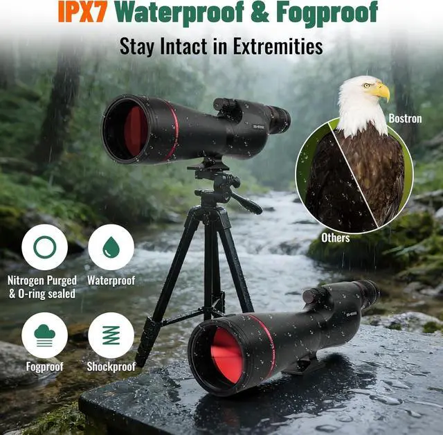 Waterproof & FogproofThe nitrogen-filled, waterproof and fog proof design allows spotting scopes to withstand the harshest environments. O-ring seals prevent moisture and dust from penetrating the scope and nitrogen purging provides better waterproof performance. The built-in sunshade reduces glare and shields the objective lens from rain and snow