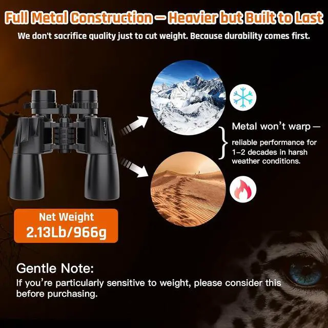 Weight Reminder--the binoculars design requires a metal barrel to ensure stability, and it is recommended to use a tripod (not portable). Additional purchase: B0D9TK1D64.Certified by Amazon Climate Pledge Friendly, it is made of environmentally friendly materials and supports sustainable development!