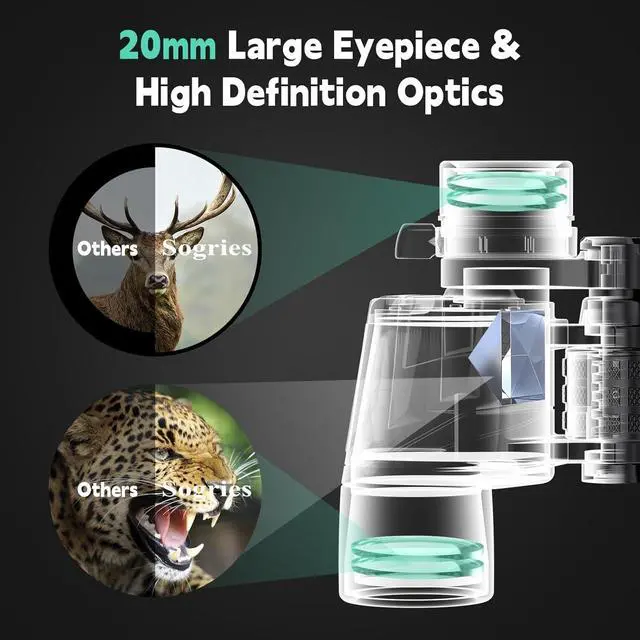 HD & High-Contrast Images--The BAK-4 prisms and FMC multi-coated broadband green film in these bird watching binoculars produce crisp images, accomplish correct colour reproduction, and have a light transmittance of up to 99.5%. These features also help to prevent glare and protect our eyes. The zoom binoculars offer brighter eyesight in low-light situations like twilight but not for completely black nights. Clear low-light vision.