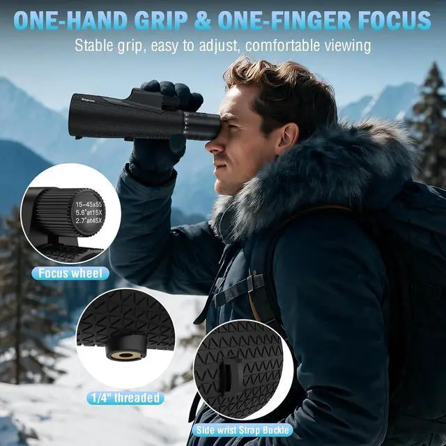 Lightweight and Portable, Non-Slip Design - This high power monoculars features a compact, high-quality precision design and a rubber armored design for a non-slip grip. The focus wheel has a damped feel for quick focus adjustment. Weighing only 1.0 ounce (464g), it can be easily held one-handed outdoors, making it an ideal hiking companion.