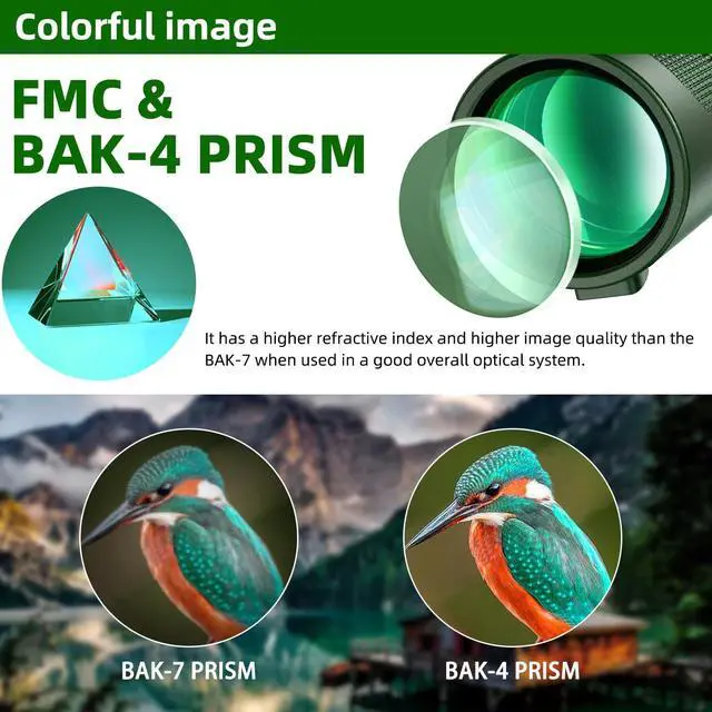 Premium SMC & BAK-4 Prism The HD monocular telescope equipped with BAK-4 optics prism and SMC (Super Multi-Coating) green lens, which could make monocular's light transmittance up to 99.8% and provide clear and sharpe pictures. And it has low-light-level night vision.