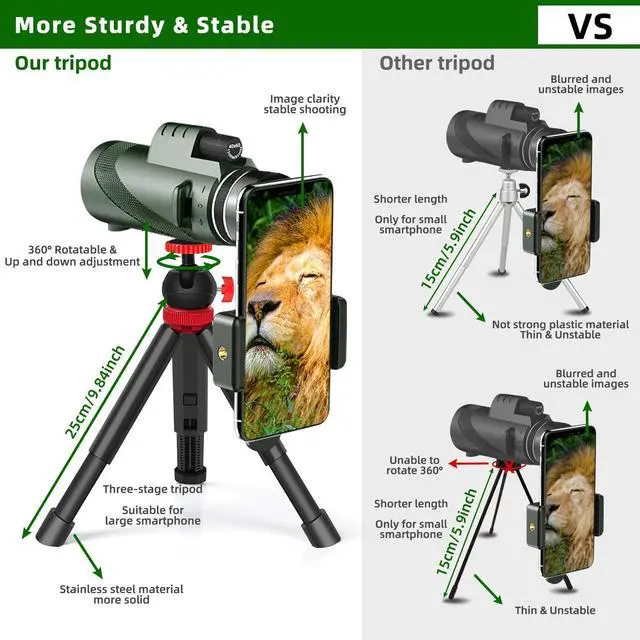16X52 HD MAGNIFICATION16x magnification and 52mm object lens diameter monocular, provides a clearly, bright image and different fields of view, Perfect for Hiking, Climbing, Bird watching, Ball games, Concerts, traveling, Watching Wildlife and Scenery.