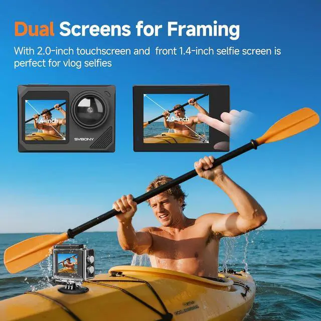 Dual Screens for Framing;The 2.0-inch touchscreen makes operation a breeze; Front 1.4-inch selfie color screen is perfect for vlog selfies, this underwater camera compatible with a retractable floating Handy Gri
