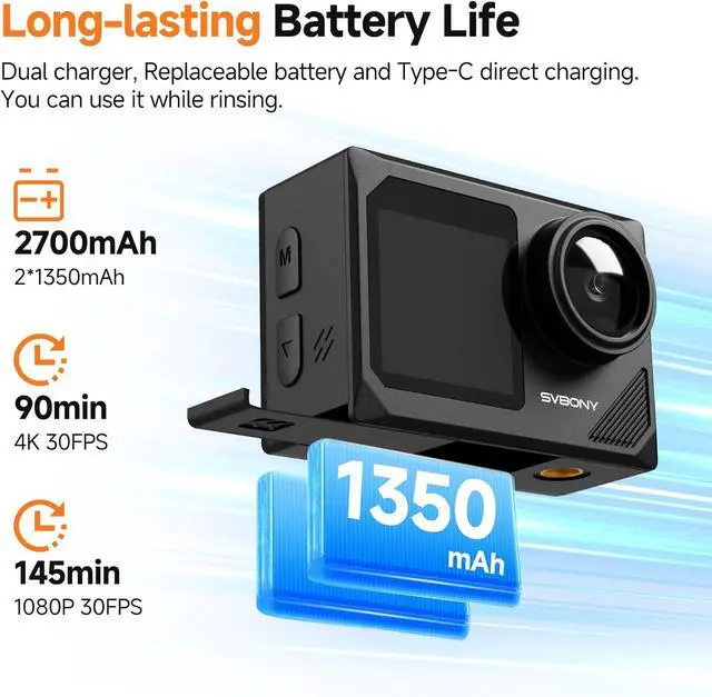 Extended Battery Life for Long Days Out; Underwater camera comes with 2*1350mAh rechargeable batteries; Giving you up to 3 hours of continuous 4K recording; The convenient USB-C port allows for emergency charging