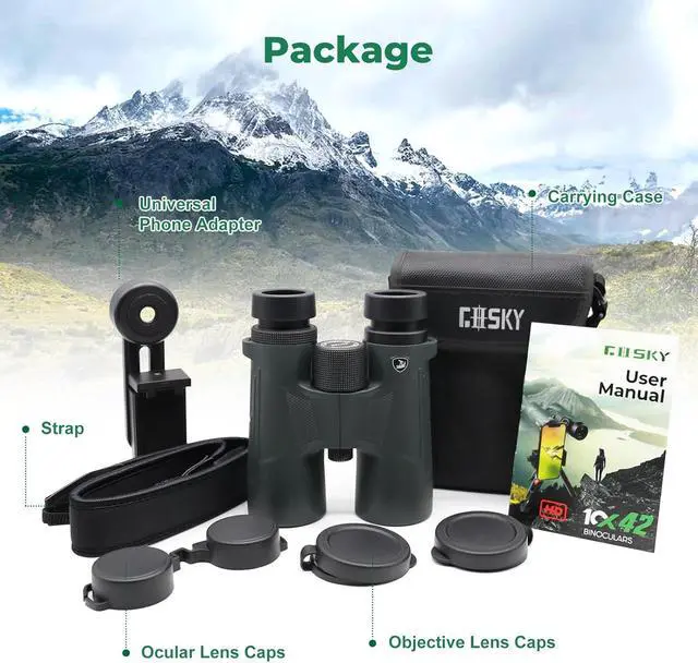 High Powerful BinocularsDesigned with 10X magnification and 42mm objective lens, provide a wider field of view, letting you look farther, clearer and brighter. It's a ideal binoculars for bird watching, hunting, hiking, travel sightseeing, and outdoor sports