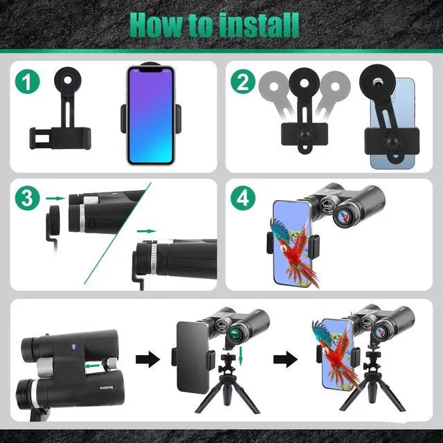 Upgraded Phone Adapter, 360 Degrees Rotatable and Stable TripodThe bird watching binoculars come with a new phone adapter and a 360° tripod so you can stabilize your phone to take clearer and more beautiful photos.Perfect for photographing quick set-up, fit for all kinds of smartphones.