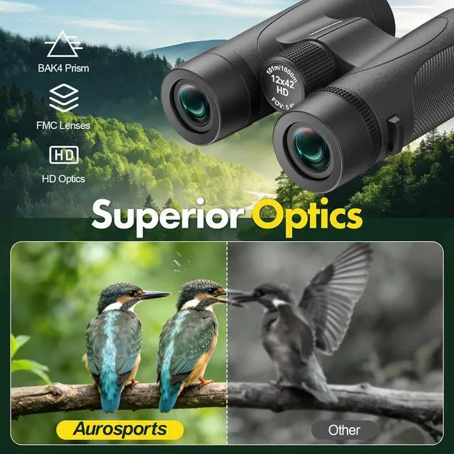 12x42 Binoculars for Adults High Powered - Aurosports Nitrogen-Purged IPX7 Waterproof HD Binoculars for Bird Watching and Hunting with BAK4 Prism Long Range Binocular Black