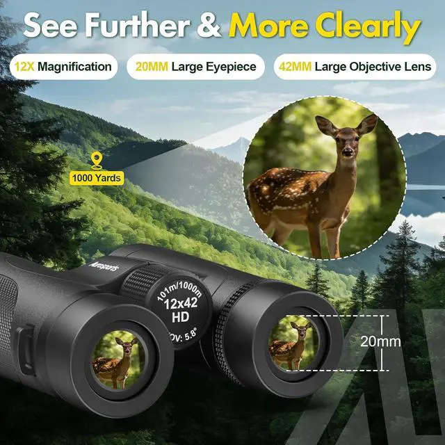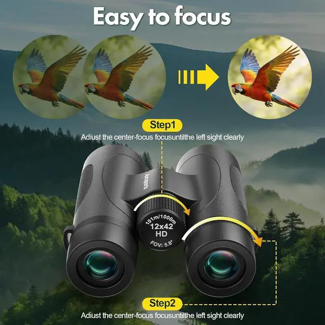 [12x High Power & HD Optical Precision] Experience ultra-sharp clarity with these high power binoculars. Featuring a 12x magnification and 42mm objective lens, our binoculars for adults high powered utilize premium BAK4 prisms and Fully Multi-Coated (FMC) lenses. This ensures 99%light transmission for edge-to-edge brightness, making them the ideal binoculars telescopes optics for low-light hunting or dawn bird watching.