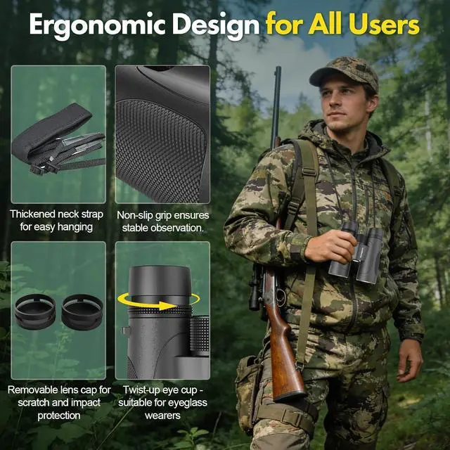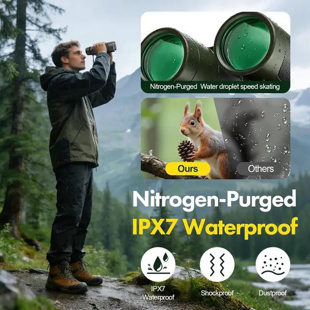 [Nitrogen-Purged IPX7 Waterproof] Built for Hunting & Bird Watching Nitrogen-purged for IPX7 protection, these waterproof binoculars excel as binoculars for hunting in rugged terrain or bird watching binoculars for adults in humid forests. These durable binoculares feature a rubber-armored body to withstand heavy rain and fog, functioning as tough tactical binoculars in all-weather environments from -10°C to +50°C.