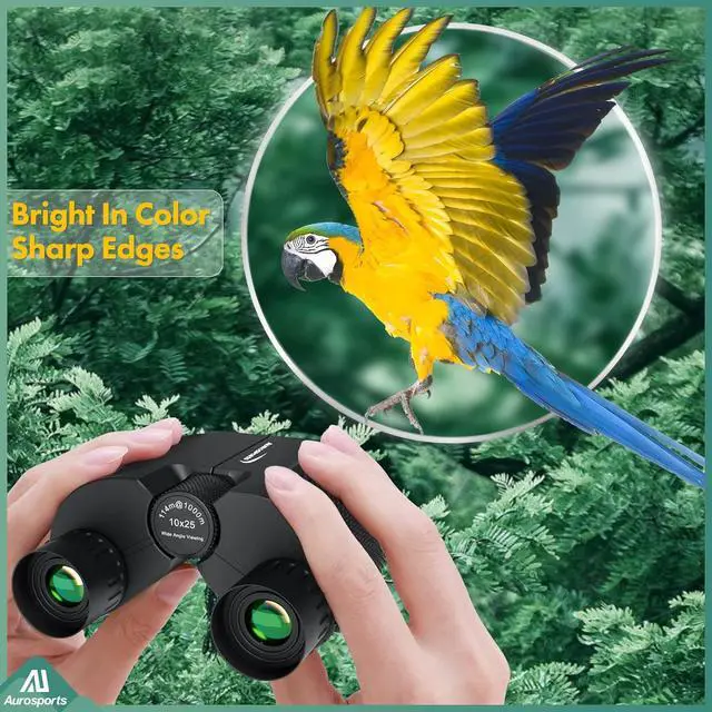 10x25 Compact Binoculars for Adults & KidsAurosports 10x25 binoculars provide a more comfortable and large vision. 10x power magnification, helps quickly catch long range target 10x closer. Aurosports binoculars provides brighter, clearer images and more comfortable observation for you. Perfect for birdwatching, cruise ship, travel, hunting, you and your family can use this compact binocular anytime.