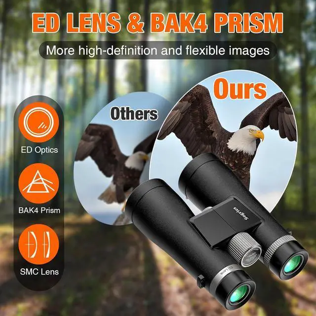 HD & High-Contrast Images--The BAK-4 prisms and FMC multi-coated broadband green film in these bird watching binoculars produce crisp images, accomplish correct colour reproduction, and have a light transmittance of up to 99.5%. These features also help to prevent glare and protect our eyes. The zoom binoculars offer brighter eyesight in low-light situations like twilight but not for completely black nights. Clear low-light vision.