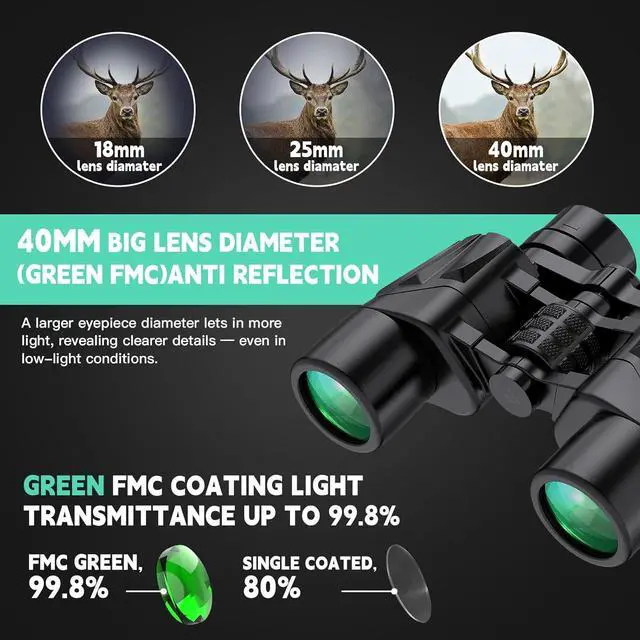 HD & High-Contrast Images--The BAK-4 prisms and FMC multi-coated broadband green film in these bird watching binoculars produce crisp images, accomplish correct colour reproduction, and have a light transmittance of up to 99.5%. These features also help to prevent glare and protect our eyes. The zoom binoculars offer brighter eyesight in low-light situations like twilight but not for completely black nights. Clear low-light vision.