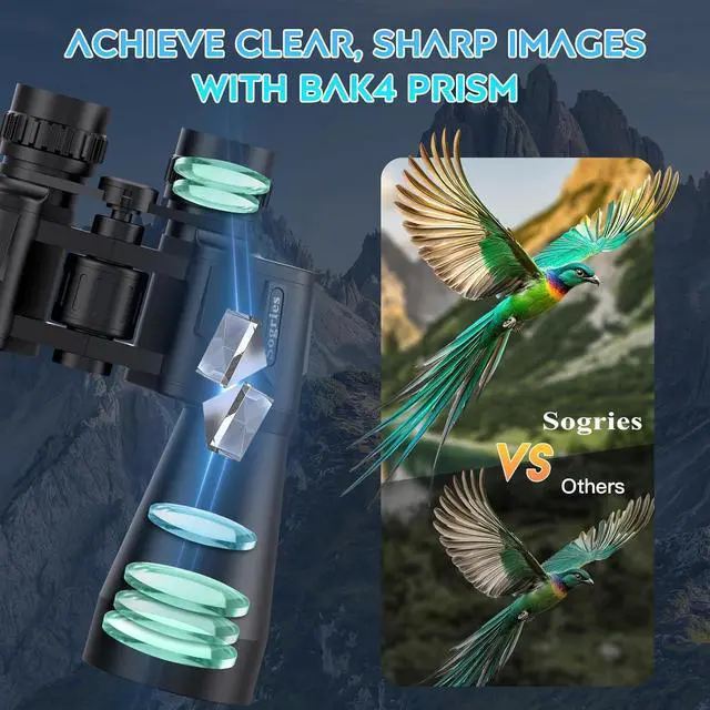 ULTRA CLEAR VISION--The high power binoculars,Multilayer-coated aspherical lens elements provide superior 99.8% light transmission and minimal distortion,BAK4 Porro Prism has a higher refractive index, improves color reproduction.make the color of the observed target more realistic,Let you see more clearly, more easily and more realistically, whether it is outdo