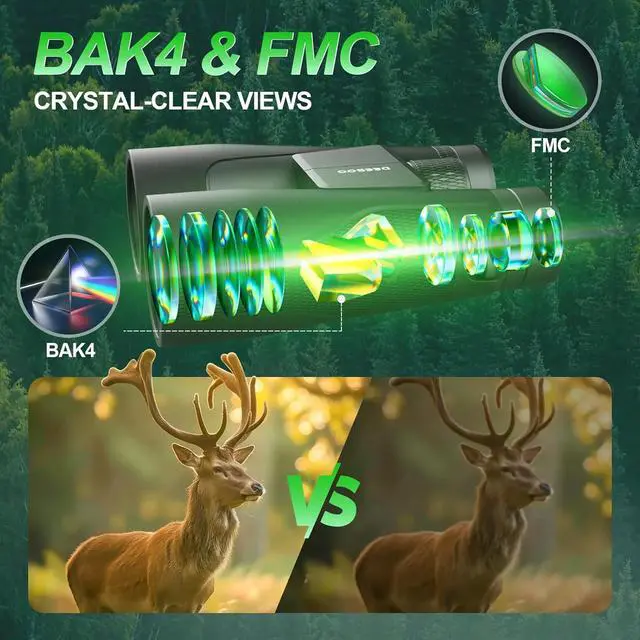 56mm Objective Lens & BAK4 Prisms for Superior BrightnessThe 56mm large objective lens captures 30% more light than standard models, ensuring vivid, high-contrast images at dawn, dusk, or under overcast skies. BAK4 prism optics on the binoculars for bird watching enhance clarity and color accuracy for razor-sharp, distortion-free viewing.