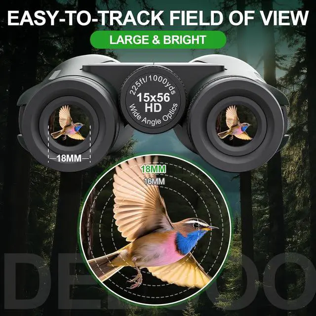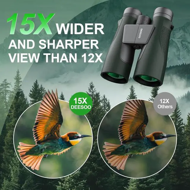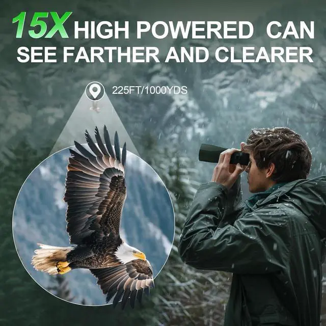 15x High Magnification for Long-Range ClarityThe binoculars for adults offers an experience stunning detail with 15x magnification and a 225ft/1000yds field of viewideal for birdwatching, hunting, or stargazing. Outperform traditional 10x binoculars with sharper, brighter images of distant objects, whether tracking wildlife or celestial bodies.