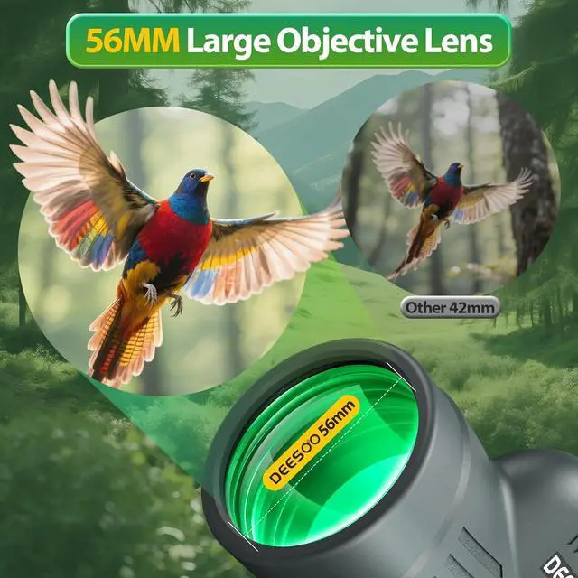 Crystal Clear Vision: Deesoo 12x56 binoculars provide 12x high magnification, easily capturing distant details, and the 56mm super-large objective lens allows 2.5 times more light than ordinary 42mm lenses, presenting bright and clear images even at dawn, dusk or moonlight. Ideal for bird watching, hunting and astronomical observation.