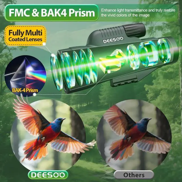 Excellent Optical Components: Adopting fully multi-coated (FMC) lenses and BAK4 prisms, the light transmittance is up to 98%, the color reproduction is true, and the image is sharp and glare-free. ED extra-low dispersion glass effectively reduces chromatic aberration and the edge image is distortion-free. It can also be used in low-light environments.