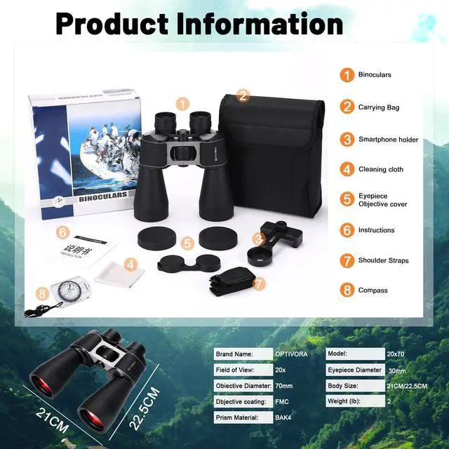 20 * 70 Binoculars for Adults High Powered for Bird Watching,Hunting and Traveling with BAK4 Lens,Kit Also Includes Long Range Binoculars Tripod Adapter,Compass and Carrying Bag