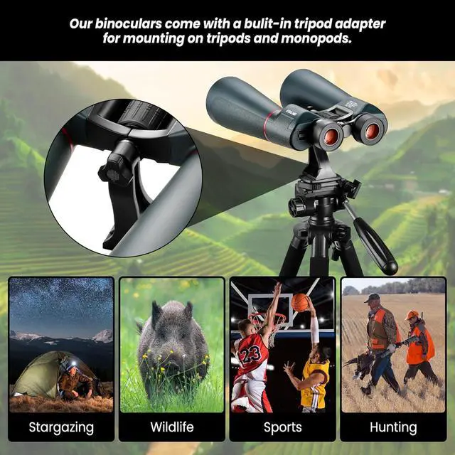 Astronomy Binoculars with smartphone adapter and Tripod Adapter: Phone adapter with rubber sucker, which can 180°angle and length adjustment,is easy to set up and take images. Tripod adapter for steady, hands-free viewing.
