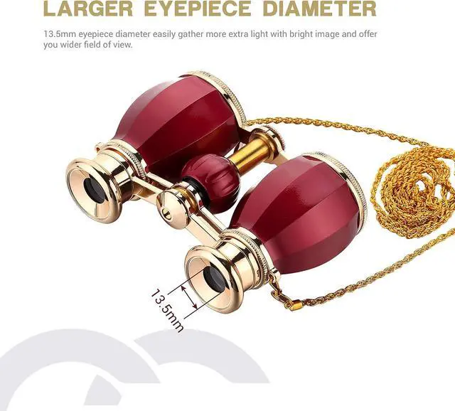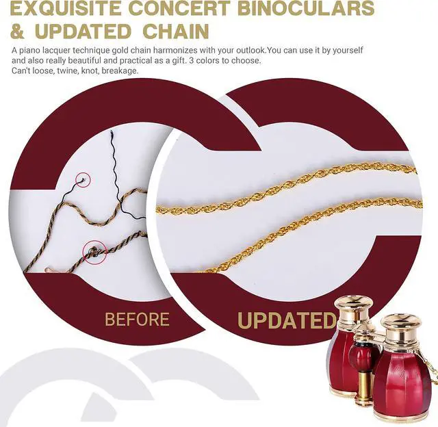 Exquisite Concert Binoculars : Binoculars come with a updated delicate gold chain harmonizes perfectly with your outlook. Compared to the old chain with black lines, it cant loose,twine,knot and breakage. This appearance is applied in a piano lacquer technique.