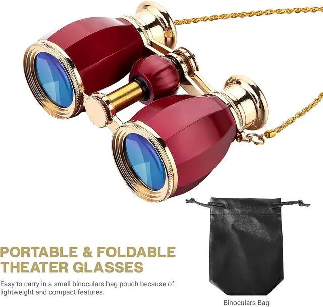 Portable and Foldable Theater Glasses: It is easy to carry in a small binoculars bag pounch because of lightweight and compact features. There are 3 colors to choose. Red one is elegant for lady, then black or gold one is suitable for gentleman, even for ladies.Its an exquisite and perfect choice for birthday, Christmas, Thanksgiving, New Year Day.