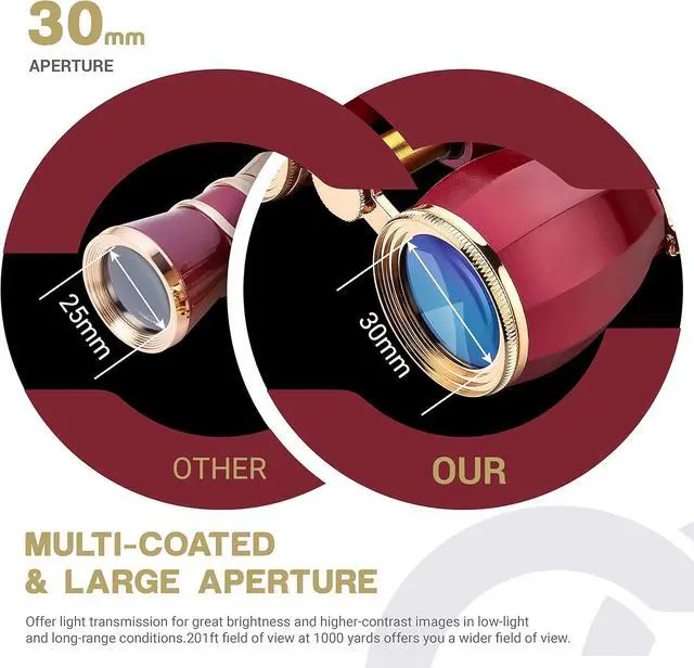 30mm Multi-coated Objective Lens :30mm lens with broadband coating technology allows an optimal bright, wider angle of view. This mini binoculars easily gather more extra light and has 3.2mm larger eyepiece than 25mm small aperture traditional one with brighter imaging. Adjustable interpupillary distance offers you more comfortable feeling of view.