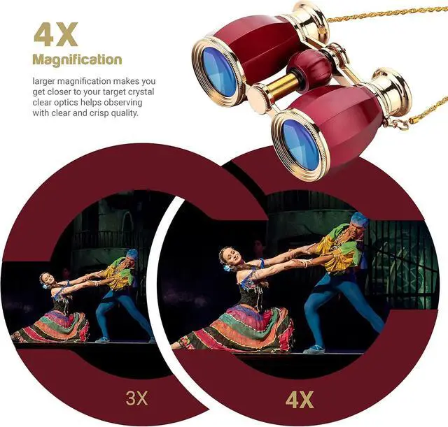 Magnification Power: Our updated theatre binoculars has 4X powerful magnification, which is larger magnification than 3X concert binoculars and better sharpness.With crystal clear optics, it helps observing every player's faces and gestures with clear and crisp quality.