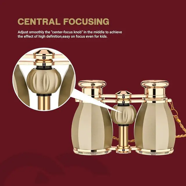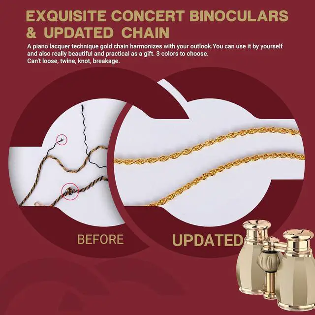 Exquisite Concert Binoculars : Binoculars come with a updated delicate gold chain harmonizes perfectly with your outlook. Compared to the old chain with black lines, it cant loose,twine,knot and breakage. This appearance is applied in a piano lacquer technique.