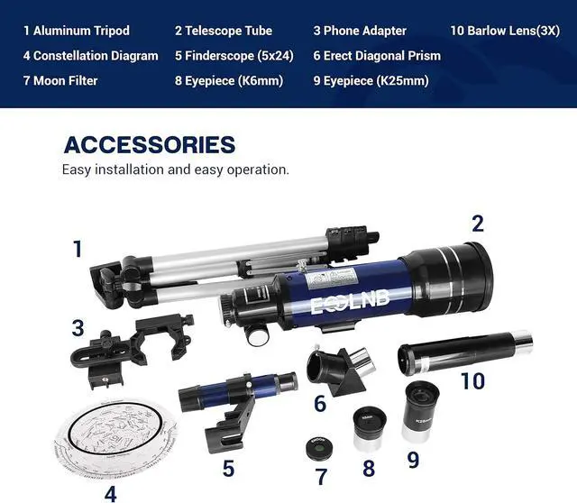 Easy Installation: The telescope with the detailed installation manual is easy to assemble even for astronomy beginners. And the beginner telescope is easy to focus, so you can find targets quickly and see clear images. Great choice to send the amateur astronomers and beginners.