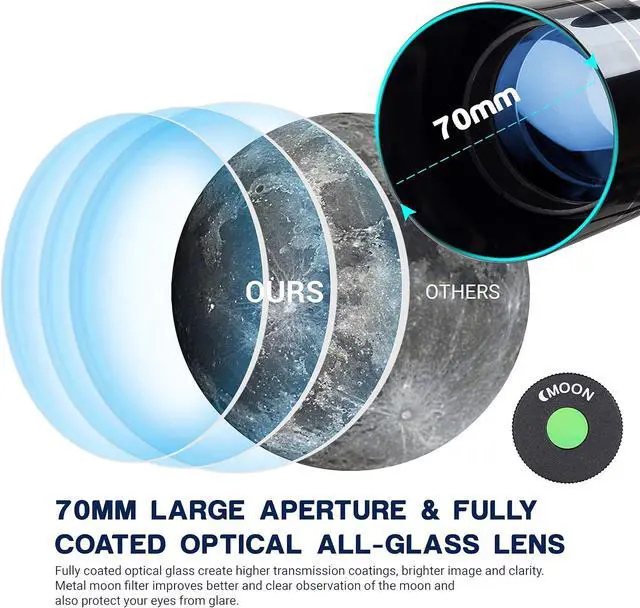70mm Large Aperture: Equipped with 70mm aperture and 360mm focal length, adult beginners telescope increase light transmission and provide clearer images. Fully multi-coated optical glass with high transmission coatings creates crisp images with increased brightness and clarity.