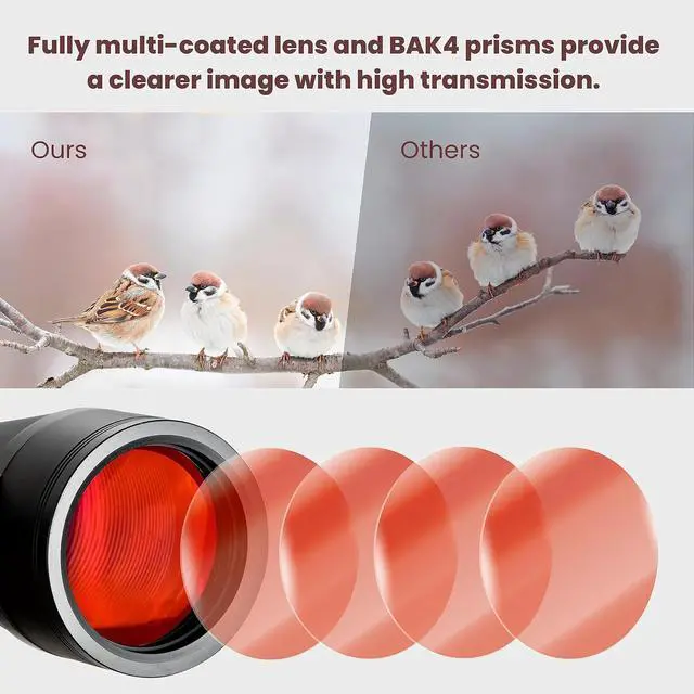 80mm Large Objective Lens:The field of view is wider with 80mm large lens than it is with 70mm. In low-light and long-range situations, 80mm fully multi-coated lens and BAK4 prisms ensure greater light transmission, bringing you crystal clear views with higher contrast and less color errors and distortions.