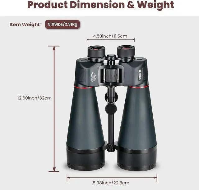 Easy to Setup & Carry:The astronomy binoculars are easy to use and only need to be adjusted using the central focus wheel. 177ft field of view at 1000 yards offers you a wider field of view. The binoculars come with a bag for easy carrying. Perfect for bird watching, travelling, stargazing and hunting (Product Dimension: 12.6 x 8.98 x 4.53 inch, Weight: 5.09 lbs).