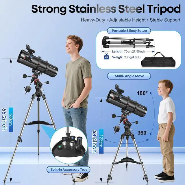 Sturdy Tripod & Carry Bag: Heavy-duty stainless steel tripod with adjustable height ensures stable viewing. A built-in accessory tray keeps eyepieces organized. All parts, including the telescope tube, fit into the carry bag for convenient storage and travel