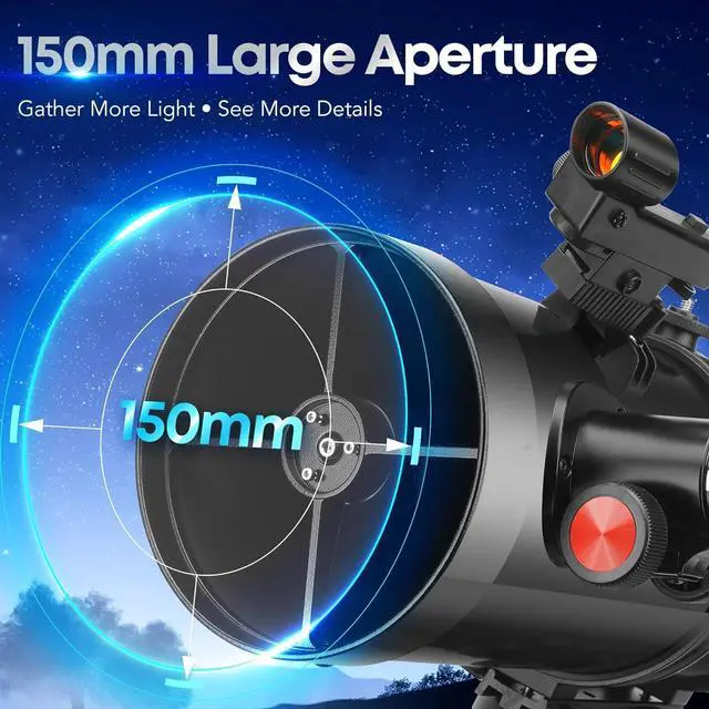 150mm Large Aperture: This astronomical reflector telescope for adults features a 650mm focal length and 150mm aperture, delivering excellent light-gathering power for bright, clear images. Ideal for deep space observation, planets, and the Moon in stunning detail