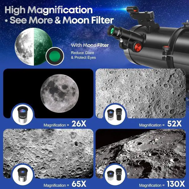 High Magnification & Clear Optics: Equipped with two eyepieces (25mm & 10mm) and a 2X Barlow lens, this telescope for astronomy beginners offers magnification from 26X to 130X. The red dot finderscope ensures fast targeting, while the moon filter reduces glare for comfortable lunar viewing