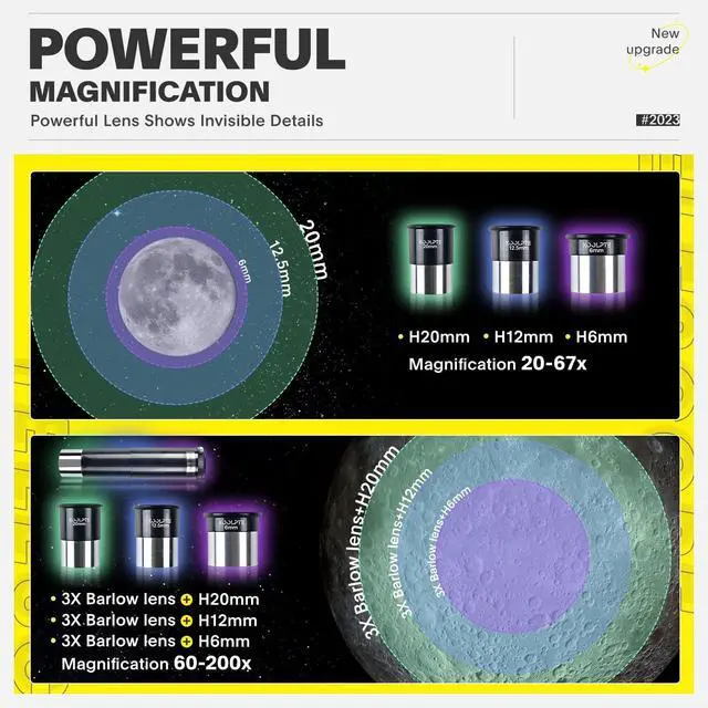 20X-200X Magnification: The telescope equipped with 3 eyepieces(K6mm, K10mm, K25mm) and a 3X Barlow lens that can triple the magnifying power of each eyepiece. The telescope meets all the needs of astronomy beginners and is the best helper for children, adults and beginners in astronomy.
