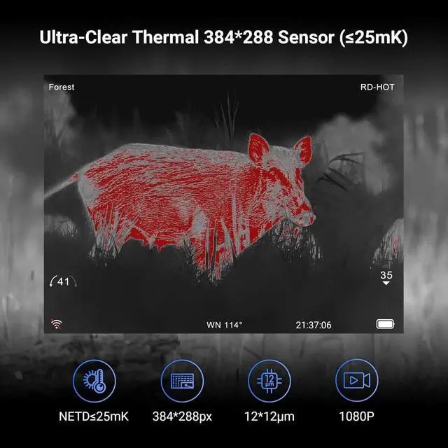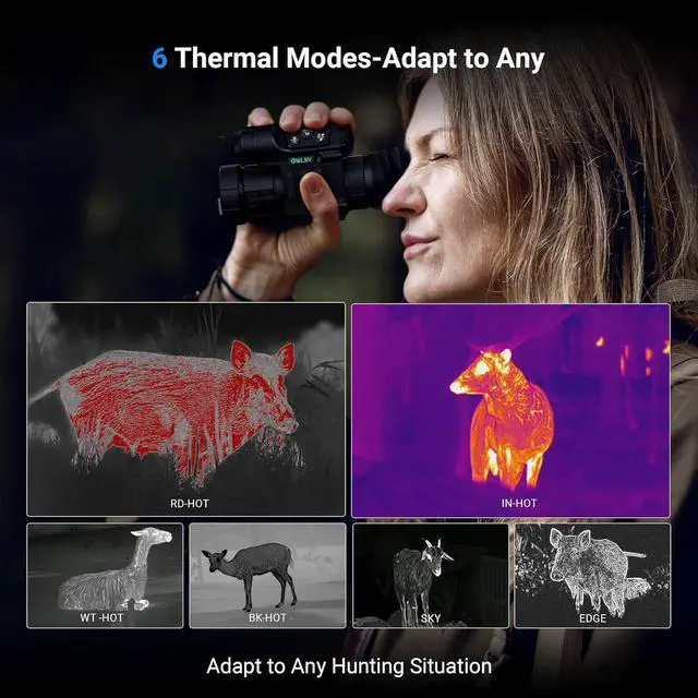 HD OLED Display with 6 Thermal Modes & WiFi Streaming Capture every detail with a 1440×1080 OLED screen. Record 1440×1080 videos and 2592×1944 photos, switch between 6 thermal imaging modes (WT-HOT, BK-HOT, EDGE, RD-HOT, IN-HOT, SKY), and stream live via built-in WiFi for instant review, saving, and sharing of your hunts.