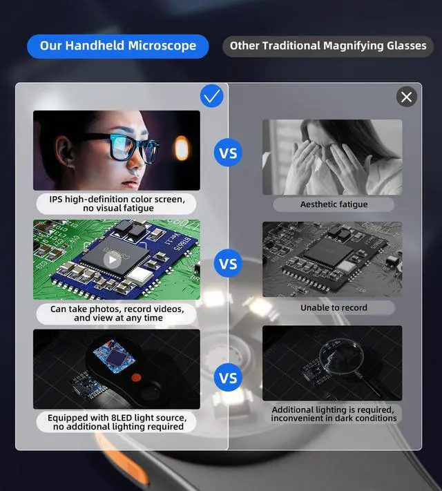 2inch IPS Screen: In the digital microscope magnifier screen observation mode, you could take photos and review in real-time. With storage space, which can take 100 pcs photos for viewing (photos cannot be downloaded but can be deleted).