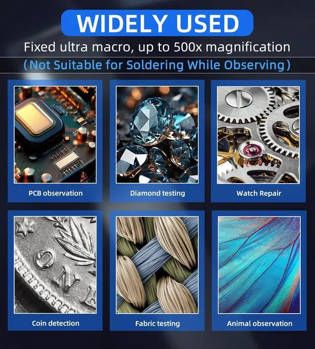 Focusing Mode: Fixed ultra macro, Max Fixed magnification up to 500x, 4x zoom adjustment knob. Simply place the microscope flat on the surface of the object to directly view the magnified object. When using, make sure the item is flat and do not touch the lens with your hands; otherwise, it may cause blurry images. Please note that this camera has a fixed focal length. Not suitable for PCB soldering, because you have to put the camera on the board surface basically.