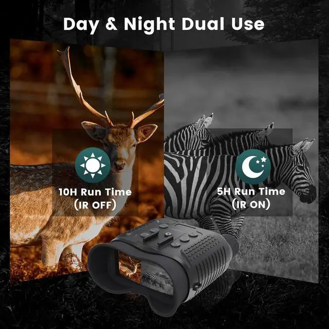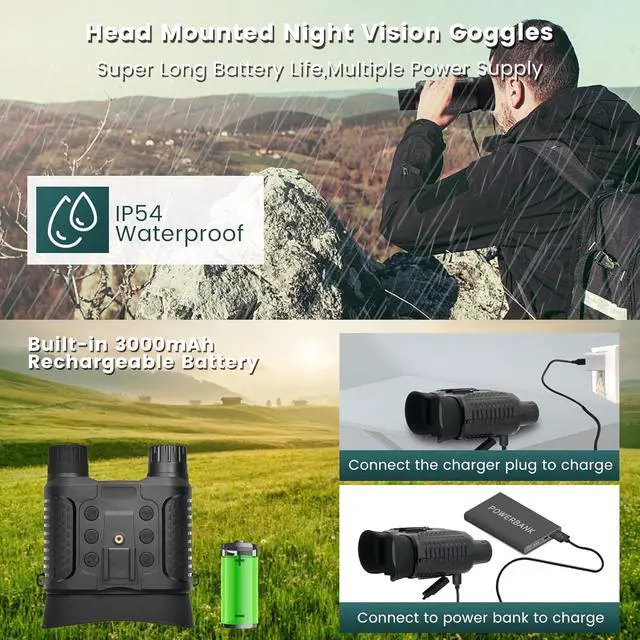 Long-Lasting BatteryThis night vision goggles for adults has a built-in 3000mAh rechargeable battery, allowing you to watch for five hours in the dark. You can charge it with a power bank or adapter. No need for AA batteries, more durable, safer and more environmentally friendly than other products.