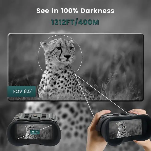 1312FT Viewing Range & Large screenThis high-definition night vision binoculars & Goggles come with 2.7" LCD super clear screen, 8X digital zoom, 10x optical magnification, fully-coated 25mm objective lens, Wide Field of View (FOV) of 8.5°, offering you a wider field of view and excellent optical clarity. You to observe animals/plants clearly up to 1312 feet in complete darkness.
