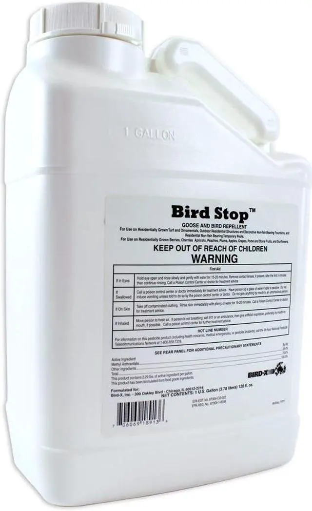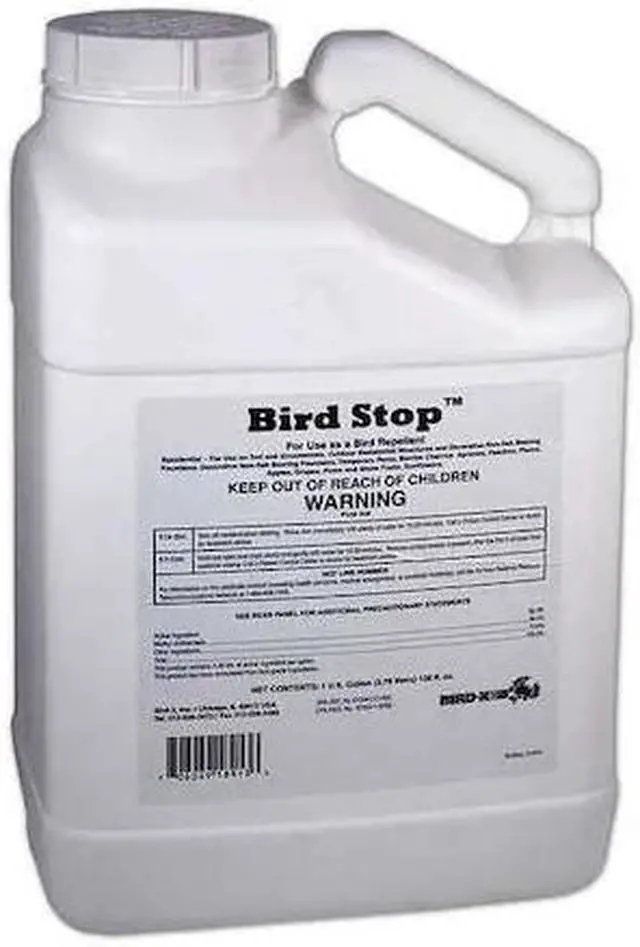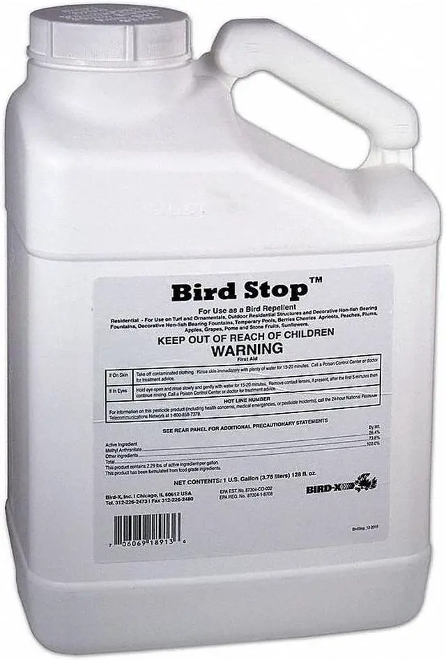 Bird Repellent, Product Type Bird Repellent, Indoor/Outdoor Use Outdoor, Targeted Animals Birds, Active Ingredients Methyl Anthranilate, Coverage Area 1 acre, Overall Height 12 in, Form Liquid, Overall Width 7 in, Color Clear, Container Size 1 gal, Overall Depth 5 in, Container Type Jug, Dilution Ratio 1:1 for Structures, 30:1 for Geese, 99:1 for Fruits and Vegetables Except Wine Grapes, Standards EPA Approved. This item has been restricted from sale in the following state (s): []