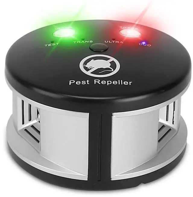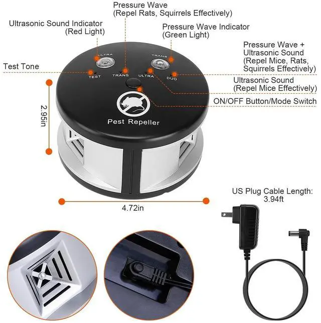 4 Modes:Simply press the power switch to choose different modes you need. ULTRA stands for ultrasonic sound which can repel mice,roaches,fleas,crickets,effectively. TRANS stands for pressure waves which can repel rats,squirrels effectively. DUO stands for pressure waves+ultrasonic sound which can repel all pests that mentioned above. TEST stands for test tone which can simulate the sounds that pest hear to check the ultrasonic sound works or not.