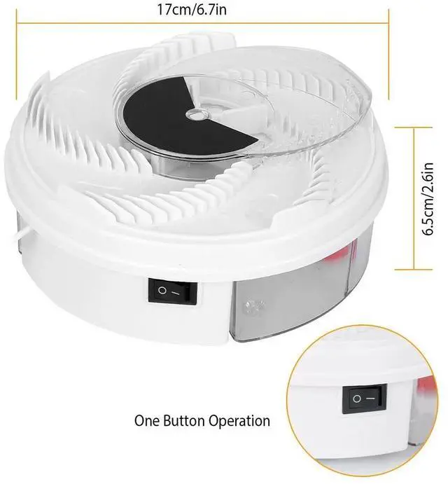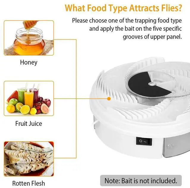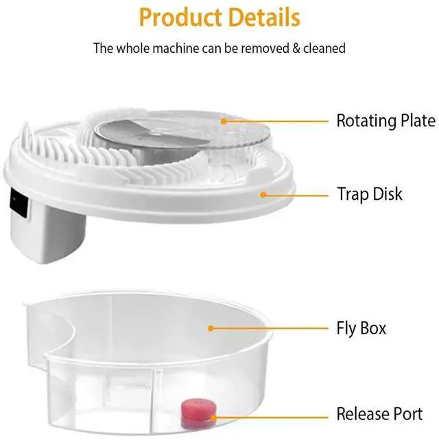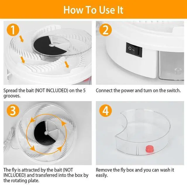 1. *Effective Fly Trap:When the flies are feasting,the rotating arm sweeps over them to trap them inside. They fly into the collection tray where they die after a few days. Unplug the red stopper on the bottom to empty tray.