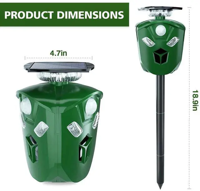 Easy To Use:Simply assemble the tube and insert it into the repeller bottom,then insert the animal repeller into the ground where there is plenty of sun light and switch it on,which is perfect for outdoor.