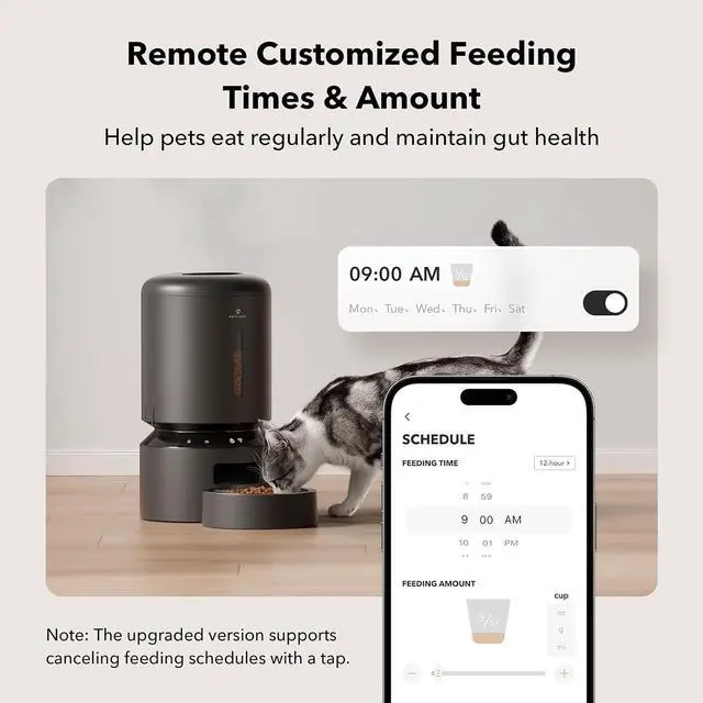 Never Miss A Meal: Easily schedule up to 10 meals per day and 1-48 portions per meal (1/12 cup each portion) with the Wi-Fi automatic cat feeder, you can easily customize your furry friends feeding plan and check the feeding records to ensure your cat has been fed on a set schedule by the APP.