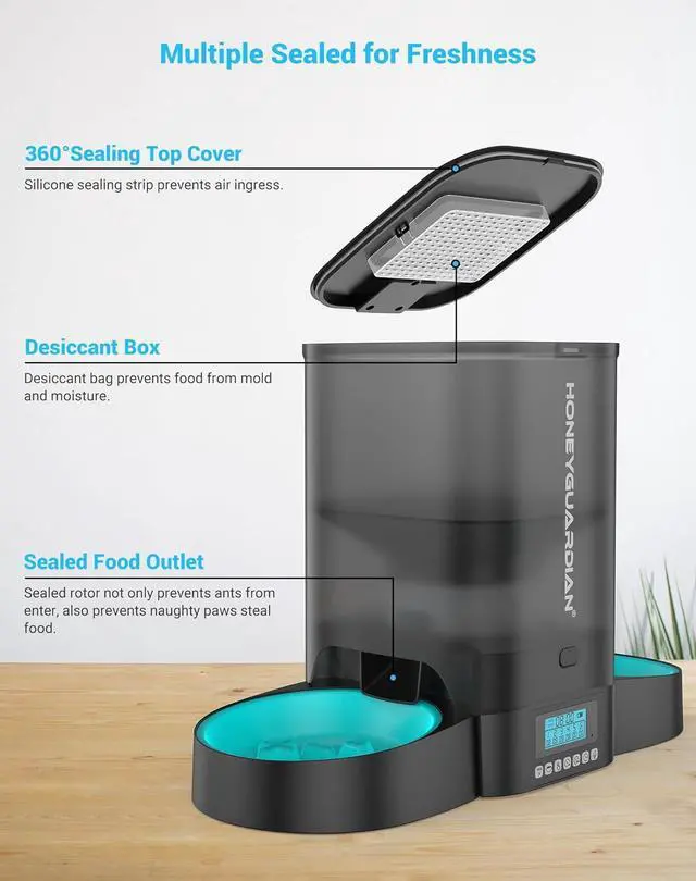 [Multiple Sealing Keeps Food Fresh] The rubber seal between the lid and the container of the automatic feeder effectively insulates the air to prevent the food from oxidizing and prevents the smell of your pets food from escaping. There is also a desiccant bag on the lid to dehumidify and prevent moisture. The unique sealed revolving door design in the feeder automatically closes the feeding port after each feeding is completed, preventing ants and insects from entering