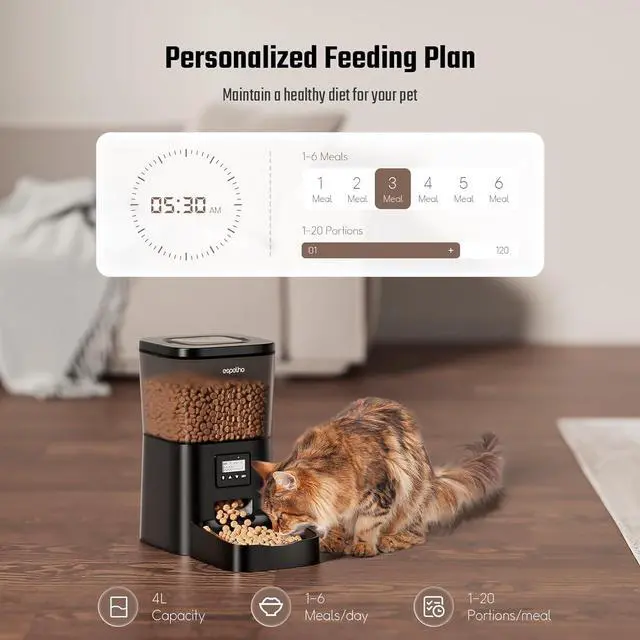 Timed Feeding: This automatic cat feeder ensures your cat or small dog gets meals on a consistent schedule; programmable settings let you serve up to 6 meals daily, with 1-20 portions per meal; Whether youre at work, on a trip, or just want to sleep in, this feeders customizable timer lets you set regular feeding schedules, so your pets meals are always on time