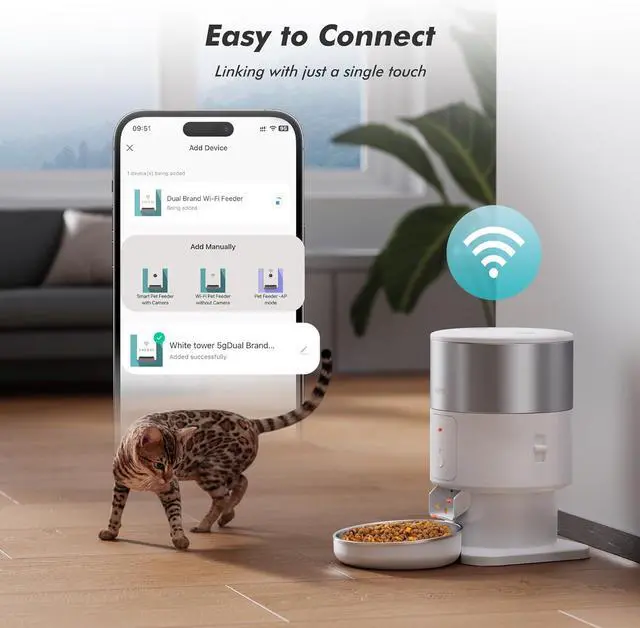 Smart WiFi Pet Feeder: The automatic cat feeder supports both 5GHz and 2.4GH z networks with excellent WiFi range for app access, allowing you to schedule and manage your pets meals remotely anytime, anywhere through the app on your phone. Setting it up is as easy as setting multiple alarms on your device, ensuring your pet never misses a meal