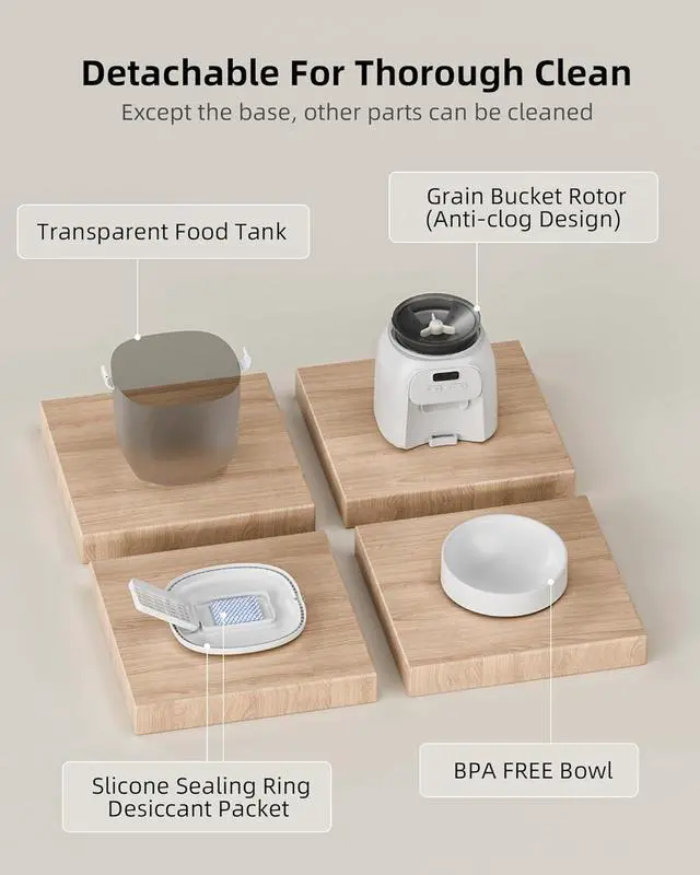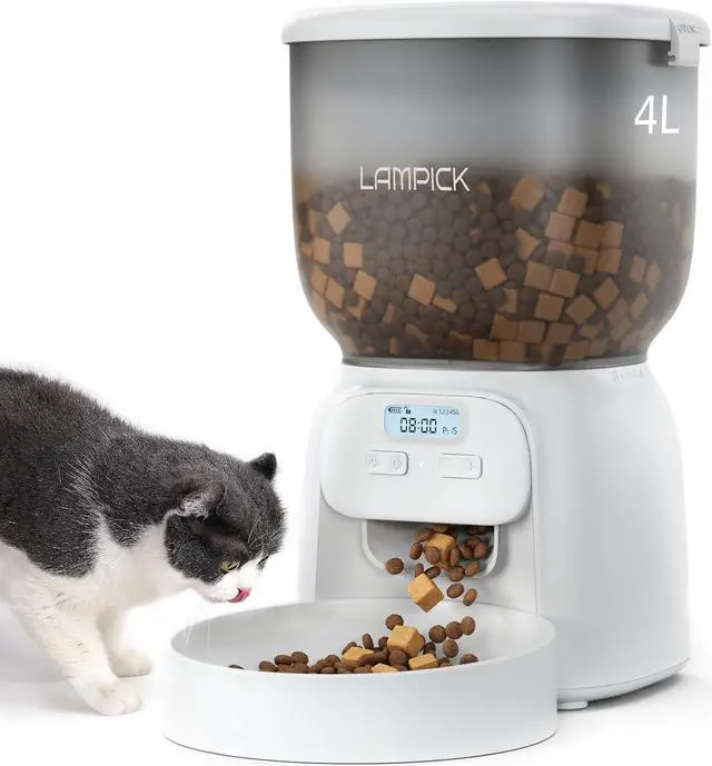Easy to Clean LAMPICK automatic cat feeder automatic can be completely disassembled in just three steps. Removable cleanable parts foster a healthy environment for your pets food. Recommended 15-35 days for cleaning food tank